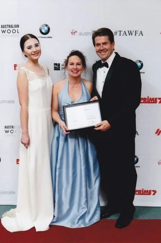 Winning my first award at The Australian Wool Fashion Awards - 2nd prize for my wedding gown presented to me by MP Kevin Anderson in 2015.